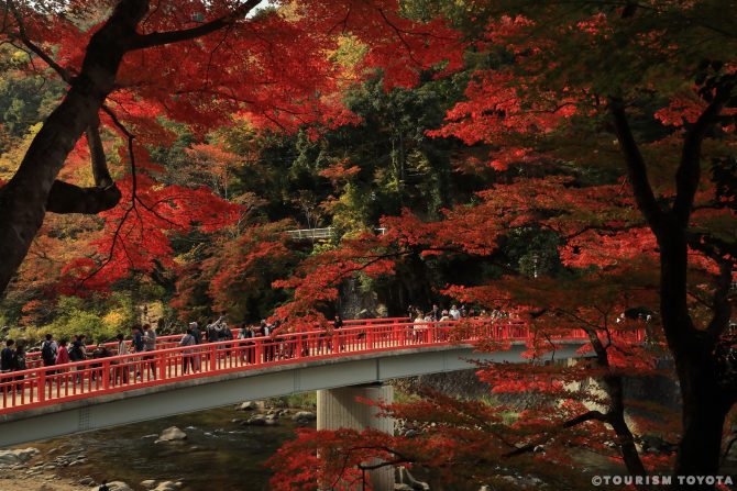 秋には美しい紅葉を、とくに紅葉の名所として全国的に知られる「香嵐渓(こうらんけい)」は、川沿いに植えられた約4,000本のカエデが一斉に色づき、県内外から多くの観光客が訪れる圧巻の風景を楽しめます。