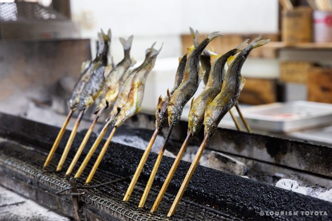 さらに、地元の美味しいお米から作られた「五平餅」も、豊田のソウルフードとして有名です。東海地方山間部だけの郷土食であるこの五平餅、じつは豊田が発祥の地という説もあり、市内には50店舗以上のお店が豊田名物として美味しい五平餅を販売しています。みそ・ゴマ・山椒などのスパイスが利いたタレと、木の香りの織りなす風味豊かな味わいを楽しめます。