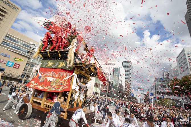 八輌の山車は、檜や樫、紫檀、黒檀などの上質な木材が使われ、豪華な山車幕や彫刻で飾られています。県の有形民族文化財にも指定されているこれらの山車が、大量の紙吹雪が乱舞するなか町内を曳きまわる様はまさに圧巻!一度見れば「来年も見たい!」と思わずにはいられない、圧倒的な迫力を感じられます。
