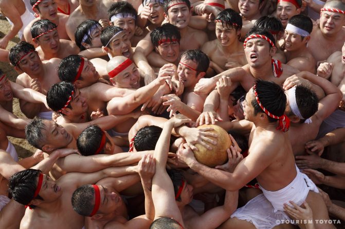 この「天下祭」は、下帯一つのみ身につけた裸男が、「水玉」と呼ばれる木製の玉に触れて厄を落とそうと激しく競い合う祭りで、「裸祭り」としても知られています。