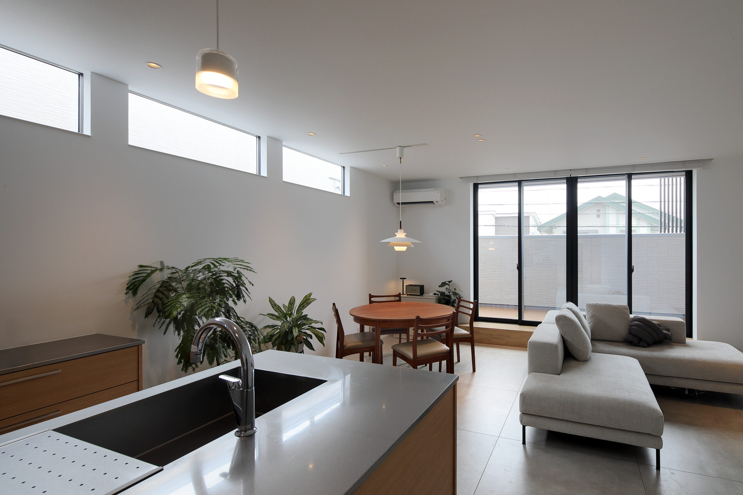 街中の一戸建てでありながら、外からの視線を気にせずカーテンを開けて空を眺めることができる大開口の窓。窓辺には、窓外のテラスとフラットに繋がるベンチを設けることで、内と外の空間の連続性を高めています。